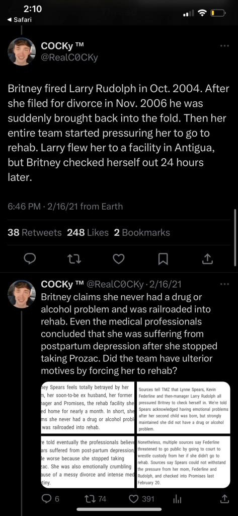 One of the things I want to find more information on is the fact that Britney fired Larry after her divorce with Kevin, then “hired” him back after the conservatorship started. I feel like I should not need to spell out for everyone how WILDLY inappropriate it is that someone she willfully terminated was rehired by hew new oppressive conservators. It makes me so mad, I was glad to find RealCocky had written a tweet about this, I want to follow up on this aspect of Britney & Larry’s history and how much he played roll in the last 13 years of trauma she endured.