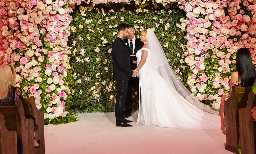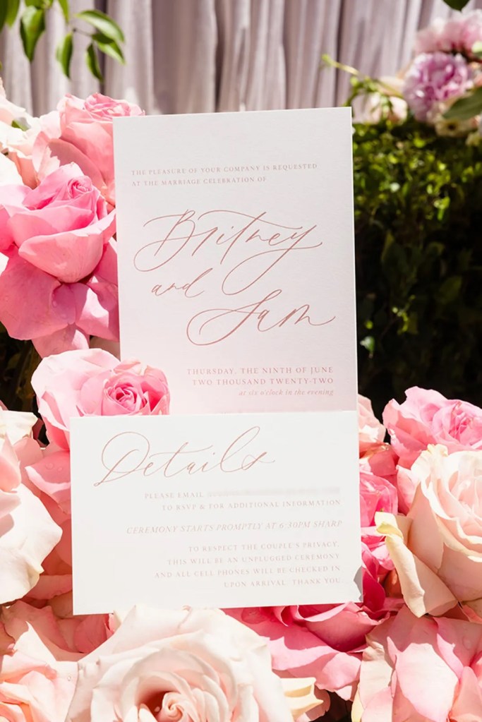 For starters, we can cover the basics, Britney wore an off-the-shoulder custom Versace dress with a slit up the side, Sam in a Versace Tux. According to Vogue, Jeffrey Best of Best Events was the wedding planner, and Britney apparently told the magazine, “We really wanted to make this a small and beautiful moment with family and friends. We wanted warm and feminine colors including blush, white, cream, and gold, and a lot of various shades of pinks, blush, and reds.” Her makeup was by Charlotte and Sofia Tilbury and, I would call it a “less is more” look, to say the least. Every picture of Britney looked like a botched photoshop, but we will get to that later on.